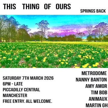 FREE PARTY: This Thing of Ours - Springs Back 2026 takes place at the renowned Piccadilly Central in Manchester, United Kingdom on Saturday, March 7, 2026, featuring Metrodome, Amy Amor, Animaux and 0 more artists. This event brings together artists and fans who share a passion for dance music culture and Techno, House sounds.
