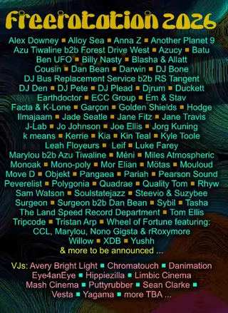 Freerotation 2026 on July 10, 2026 at Baskerville Hall, West + Wales features Alex Downey, Azu Tiwaline, Forest Drive West, Azucy, Batu, Ben UFO, Billy Nasty, Blasha & Allatt, Cousin, Dan Bean, Darwin, DJ Bone, DJ Bus Replacement Service, RS Tangent, DJ Pete, DJ Plead, DjRUM, Duckett, Earthdoctor, EM + STAV, Facta, K-LONE (UK), Garçon, Hodge, Jade Seatle, Jane Fitz, J-Lab, Jo Johnson, Joe Ellis, Jorg Kuning, k means, Kerrie, Kia (DE), Kin Teal, Kyle Toole, Leah Floyeurs, Leif, Marylou, Méni, Miles Atmospheric, Monoak, Mono-poly, Mor Elian, Mötas, Mouloud, Move D, Objekt, Pangaea, Pariah, Pearson Sound, Peverelist, Polygonia, Rhyw, Sam Watson, Steevio, Suzybee, Surgeon, Sybil, Tasha, The Land Speed Record Department, Tom Ellis, Tristan Arp, CCL, Nono Gigsta, rRoxymore, Willow, XDB and Yushh performing techno DJ sets.