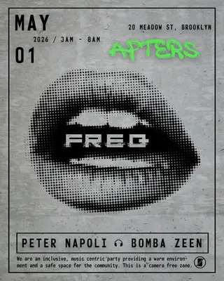 FREQ Afters takes place at 20 Meadow in New York City, United States on May 2, 2026. Featuring Peter Napoli, BOMBA ZEEN. Techno and House sounds all night.