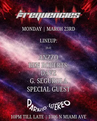 FREQUENCIES: ANZZO, Ben Roberts, DAVE, G.SEGUROLA takes place at Paraiso Estereo in Miami, United States on March 23, 2026. Featuring Ben Roberts, Dave (It). House and Tech House sounds all night.