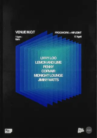 Frogwork & HIPJOINT at M.O.T takes place at M.O.T in London, United Kingdom on April 17, 2026. Featuring Jiminy Watts, Corvair, Livvy Loo. Deep House and Minimal Techno sounds all night.
