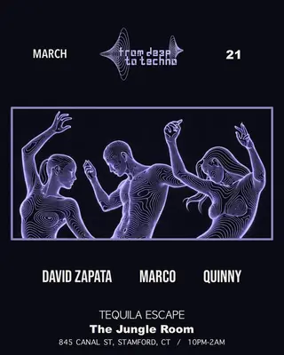 From Deep To Techno At Tequila Escape on March 21, 2026 at TBA - Tequila Escape, Connecticut features David Zapata, Marco Fe and Quinny performing house DJ sets.