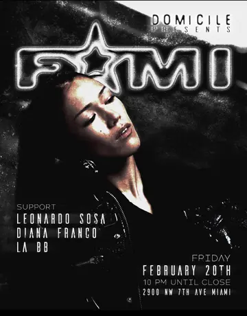 FUMI Miami debut at Domicile Friday, February 20 we are very excited for this show and we we hope you are as well FUMI is a true musician at the frontline of modern techno, her sound carries a deep understanding of rhythm, structure, and tension — elements that now define her high-impact techno sets. Now based in Europe, FUMI has become one of the most talked-about artists in the global techno circuit, recognized for her intense energy, precision, and commanding presence behind the decks. She is also a core member of the 240 KM/H collective, a crew known for pushing fast, forward-thinking, and uncompromising techno. Supporting the night: DIANA FRANCOLEONARDO SOSA LA BB Doors open 10PM