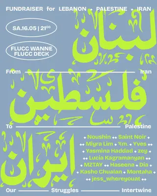Fundraiser: Music for Lebanon, Palestine & Iran on May 16, 2026 at FLUCC, Vienna features Miyra Lim, মm., yves, zey, Lucia Kagramanyan and DIA (GER) performing DJ sets.