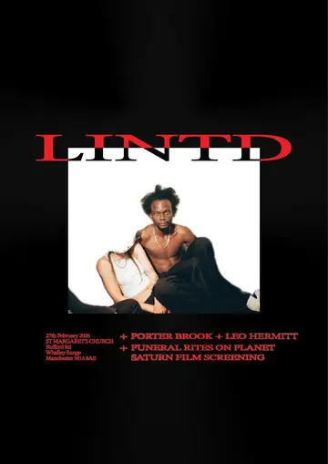 LINTD presents Funeral Rites at St Margaret's Church LINTD celebrates his sophomore offering - FUNERAL RITES ON PLANET SATURN - for the first and only time in Manchester, with an open invitation to black Utopia on sacred ground. Joined by executive producer Porter Brook and supported by multidisciplinary artist, musician and poet Leo Hermitt. ALL DOGS ALL BLACKS ALL IRISH GO TO HEAVEN. Ameen — Line-up: LINTD (Live) Porter Brook Leo Hermitt (Live) Funeral Rites On Planet Saturn, preorder out now via FUMU new label ‘Return to Zero’. ----- St Margaret's Church, Rufford Rd, Whalley Range, Manchester M16 8AE