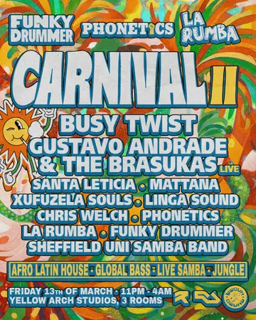 Funky Drummer x La Rumba x Phonetics Carnival: Busy Twist, Gustavo &The Brasukas, Santa Leticia takes place at Yellow Arch Studios in Paris, France on Friday, March 13, 2026. Featuring The Busy Twist, Santa Leticia, La Rumba. Rio Funk, Latin Bass.