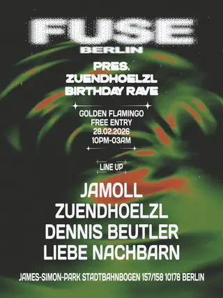 FUSE PRES. ZUENDHOELZL BIRTHDAY RAVE takes place at Golden Flamingo in Berlin, Germany on February 28, 2026. Featuring JaMoll-official, Dennis Beutler, Liebe Nachbarn. Techno and Tech House sounds all night.