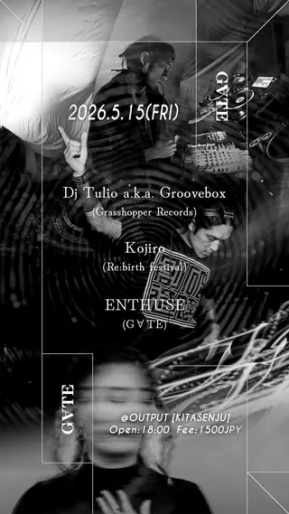 G∀TE {Psytrance & Techno} takes place at Output in Tokyo, Japan on May 15, 2026. Featuring Kojiro, ENTHUSE. Trance and Techno sounds all night.