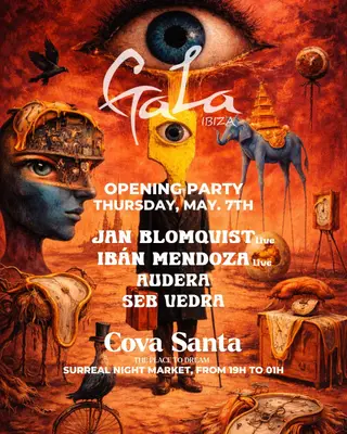 Gala by IBÁN MENDOZA takes place at Cova Santa in Ibiza, Spain on May 7, 2026. Featuring Jan Blomqvist, IBÁN MENDOZA, Audera. Progressive House.