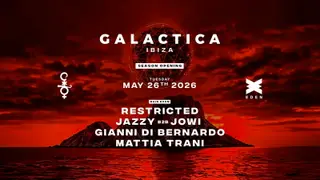 Galactica Ibiza with Restricted, Jazzy B2B Jowi takes place at Eden in Ibiza, Spain on May 26, 2026. Featuring Restricted, JAZZY (2), Gianni Di Bernardo, Mattia Trani. Techno.