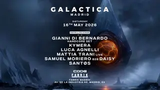 Galactica Madrid with Luca Agnelli, Mattia Trani live, SAMUEL MORIERO b2b Daisy-it on May 16, 2026 at Fabrik, Madrid features Gianni Di Bernardo, Luca Agnelli, Mattia Trani, Samuel Moriero (2), Daisy-it and SANTØS performing techno DJ sets.