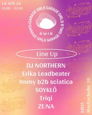 Garage Girls Kwia takes place at . in Berlin, Germany on April 18, 2026. Featuring DJ NORTHERN, Immy, Soyklo, Triqi and 1 more. Ambient and R&B sounds all night.