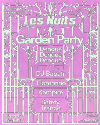 GARDEN PARTY takes place at Botanique in Brussels, Belgium, on May 14, 2026. The event features a lineup of electro artists including Dengue Dengue Dengue, known for their fusion of cumbia and electronic music from Peru, and Dj Babatr, a prominent figure in the global bass scene, also from Peru. Florentino, recognized for his contributions to the club sound from Spain, will also perform, alongside Kampire, a Ugandan DJ known for her eclectic mixes and promotion of African electronic music. Safety Trance, known for his unique take on the trance genre, rounds out the lineup.
