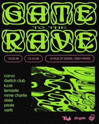 GATE TO THE RAVE takes place at Le Klub in Paris, France on March 14, 2026. Featuring KZXK, Madame Charlie. Techno and Minimal Techno sounds all night.
