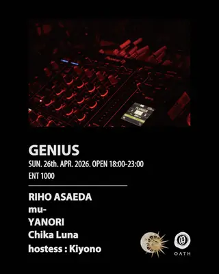 GENIUS takes place at Oath in Tokyo, Japan on April 26, 2026. Featuring RIHO ASAEDA, Chika Luna. Techno and House sounds all night.