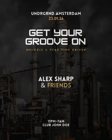 Get Your Groove On takes place at John Doe in Amsterdam, Netherlands on Friday, January 23, 2026. Featuring Alex Sharp. Techno.