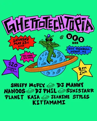 GHETTOTECHTOPIA: MOVEMENT EDITION takes place at UFO Bar in Detroit, United States on May 23, 2026. Featuring Sheefy McFly, DJ Manny, Nanoos, DJ Phil and 3 more.