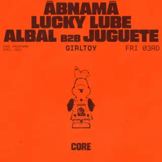 Girltoy feat. ābnamā + Lucky Lube + Albal b2b Juguete takes place at Core in Madrid, Spain on April 3, 2026. Featuring ābnamā, Lucky Lube, Albal, Juguete. Techno and Tech House sounds all night.