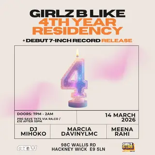Girlz B Like 4th Birthday takes place at Grow in London, United Kingdom on March 14, 2026. Featuring Marcia Carr. Disco and Funk / Soul sounds all night.