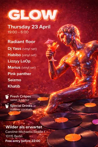 Glow takes place at Wilder als Erwartet in Berlin, Germany on April 23, 2026. Featuring MAR!US (FR), Seizmo. Techno and House sounds all night.