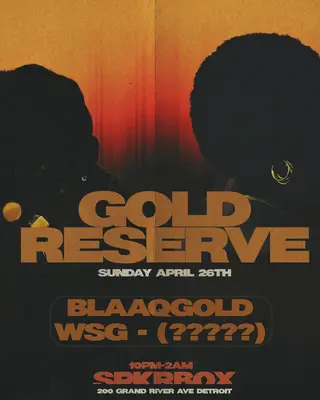 Gold Reserve takes place at Spkrbox in Detroit, United States on May 3, 2026. Featuring BLAAQGOLD. Hip-Hop and R&B sounds all night.