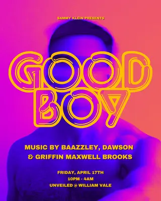 GOOD BOY on April 17, 2026 at Unveiled, New York City features BAAZZLEY, DJ Dawson and Griffin Maxwell Brooks performing house DJ sets.