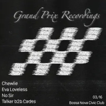 Grand Prix Recordings with: Chewlie // Eva Loveless // No Sir // Talker // Cades takes place at Bossa Nova Civic Club in New York, United States on Monday, March 16, 2026. Featuring Eva Loveless, No Sir. Bass, Dubstep.