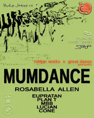 ✺ Great Danes x Rubber Works presents: Mumdance + Rosabella Allen on May 15, 2026 at Soup, Manchester features Mumdance, Rosabella, bhaz, Plan T, Lucian (UK), CONE (2) and MBB_ performing broken beat DJ sets.