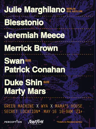 Green Machine x WYA x Mama's House on May 16, 2026 at TBA - Address sent to ticket holders day of, Chicago features Julie Marghilano, BLESSTONIO, Jeremiah Meece, Merrick Brown, patrick conahan, Duke Shin and Marty Mars performing techno DJ sets.