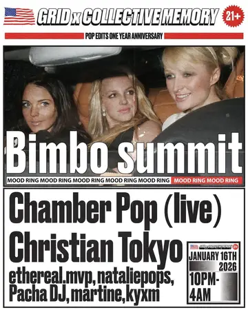 Grid x Collective Memory: Pop Edits One Year Anniversary takes place at Mood Ring in New York, United States on Friday, January 16, 2026. Featuring Christian Tokyo, ethereal.mvp, kyxm, martine (5) and 2 more.