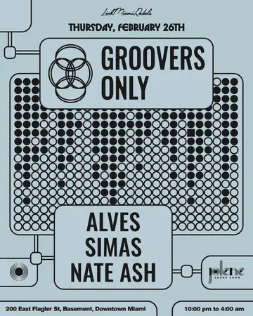 Groovers Only: Alves 2026 takes place at the renowned Jolene Downtown Miami in Detroit, United States on Thursday, February 26, 2026. This event brings together artists and fans who share a passion for dance music culture and Tech House sounds.
