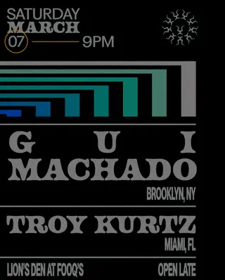 Gui Machado, Troy Kurtz on March 7, 2026 at Lion's Den, Miami features Gui Machado and Troy Kurtz performing DJ sets.