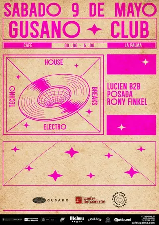 GUSANO CLUB: LUCIEN B2B POSADA + RONY FINKEL. takes place at Café La Palma in Miami on May 9, 2026. Featuring Organization.