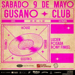 Gusano Club x Casa Cinco Showcase 5th Edicion takes place at Cafe La Palma in Madrid, Spain on May 9, 2026. Featuring Posada, Lucien (3), Rony Finkel. House and Electro sounds all night.