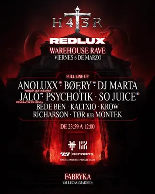 H4T3R x REDLUX 'WAREHOUSE RAVE' with BØĘRY • DJ MARTA • SO JUICE • ANOLUXX • JALO on March 6, 2026 at TBA - FABRYKA ASOCIACIÓN (VALLECAS) CAMINO DE HORMIGUERAS 142, Madrid features electronic music performances techno DJ sets.