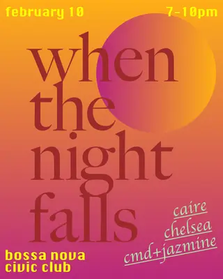 Happy Hour: When The Night Falls: chelsea, Caire, CMD+JAZMINE takes place at Bossa Nova Civic Club in New York, United States on February 10, 2026. Featuring Caire, CMD+JAZMINE. Techno and Club sounds all night.