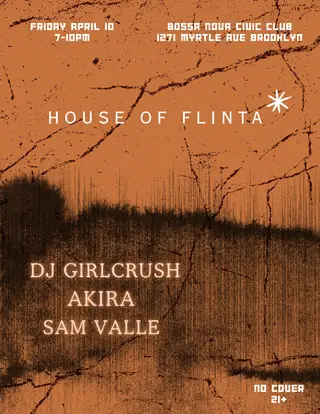 Happy Hour with House of FLINTA* takes place at Bossa Nova Civic Club in New York City, United States on April 10, 2026. Featuring Sam Valle, DJ girlcrush. Techno sounds all night.