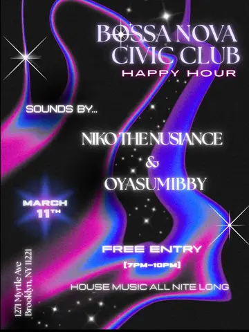 Happy House Hour with Niko & Sumi takes place at Bossa Nova Civic Club in New York City, United States on March 11, 2026. Featuring niko the nuisance. House, Deep House.