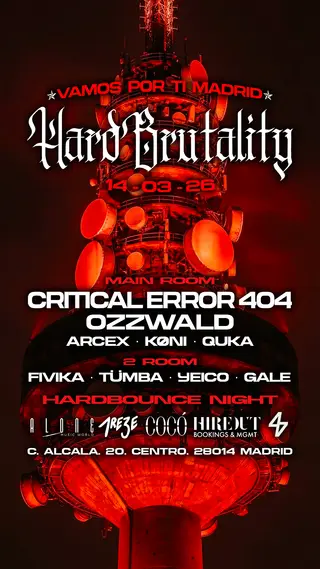 Hardbrutality takes place at Sala Cocó in Madrid, Spain on March 14, 2026. Featuring Ozzwald, ArceX, Quka. Techno and Guaracha sounds all night.