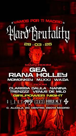 Hardbrutality takes place at Sala Cocó in Madrid, Spain on March 28, 2026. Featuring Riana Holley, clarissa dalila (2). Techno sounds all night.