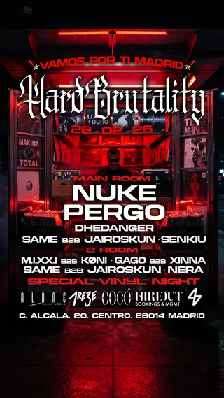 Hardbrutality on February 28, 2026 at Sala Cocó, Miami features Nuke and Pergo performing techno DJ sets.