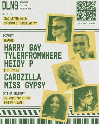 Harry Gay, TYLERFROMWHERE, Heidy P, Carozilla, Miss Gypsy - Dead Letter No.9 takes place at Cargo @ Dead Letter No. 9 in New York, United States on March 21, 2026. Featuring Harry Gay, TYLERFROMWHERE, Heidy P, Carozilla and 1 more. Techno and House sounds all night.
