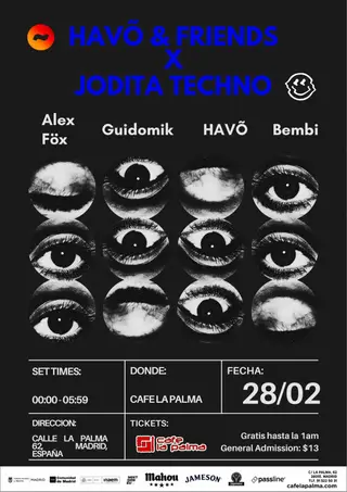 HAVÕ & FRIENDS x JODITA TECHNO takes place at Cafe La Palma in Madrid, Spain on February 28, 2026. Featuring ALEX FÖX, Bembi, Guidomik.