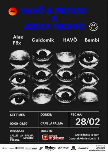 HAVÕ & FRIENDS x JODITA TECHNO takes place at Cafe La Palma in Madrid, Spain on Saturday, February 28, 2026. Featuring ALEX FÖX, Bembi, Guidomik.