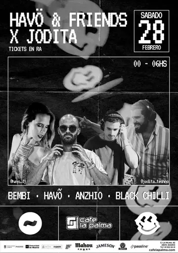 Havo x Jodita Techno takes place at Cafe La Palma in Miami, United States on Saturday, February 28, 2026. Featuring Anzhio, Bembi, HAVÕ (ES), BlackChilli. Tech House.