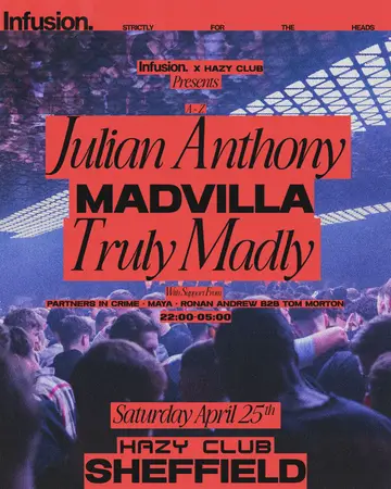 Hazy & Infusion present - Julian Anthony, Truly Madly & MADVILLA takes place at Hazy Club in Sheffield, Unknown on April 25, 2026. Featuring Julian Anthony, Truly Madly, MADVILLA. House, Garage.