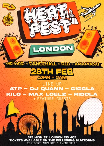 HEAT FEST LONDON / DANCEHALL - R&B - AMAPIANO - HIP-HOP takes place at Orange Room in London, United Kingdom on Saturday, February 28, 2026. Featuring Max Loelz, DJ Kilo. Dancehall, Amapiano.