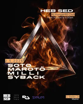 HEB SEB AT Hangar48 Club on May 2, 2026 at Hangar48 Club, Madrid features SOTO (UK), Marotö, MILLI (IT) and Syback performing techno DJ sets.