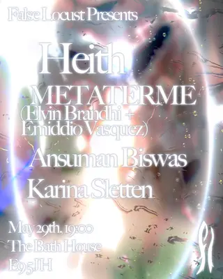 Heith, METATERME (Elvin Brandhi + Emiddio Vasquez), Ansuman Biswas, Karina Sletten (DJ) on May 29, 2026 at The Bath House, London features Heith, Elvin Brandhi and Karina Sletten performing experimental DJ sets.