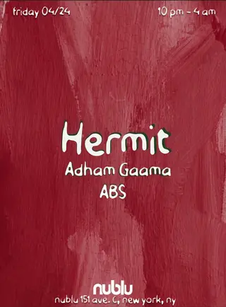 Hermit, ABS & Adham Gaama takes place at Nublu in New York City, United States on April 24, 2026. Featuring Adham Gaama, ABS (4). House and Electro sounds all night.